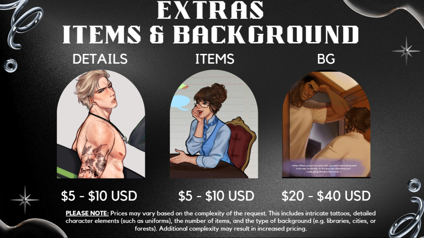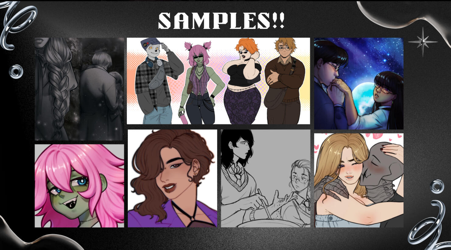1. Read the ToS! The commission form will ask if you have read the ToS.2. Fill out the commission form. It will take me a day or 2 to revise the form and contact you through your preferred method of communication.3. Consultation is then initiated. Please be clear and precise on what you want to commission me: character sheets, pose reference, and mood boards or inspiration are always great, and they'll provide me with a greater visual idea of how you want your characters to be depicted. Through this, I will be starting to draw the initial sketch (this will depend on my availability).4. After the approval of the initial sketch, and both parties are happy, an invoice is issued to the customer. Depending on the price (please refer to the ToS again), you will either be paying half or the full price.5. It may take me a week or 3 to complete the piece, depending on its complexity. During the final clean sketch phase, I will be asking for feedback on whether the customers want any changes (this is further explained in my ToS under "REVISIONS"6. Once the commission is finished, the remaining amount of the fee must be provided before the piece is finalized. I will be sending the email containing the fully rendered and edited piece, depending on the size of the file, it will be given as a zip file or as is.